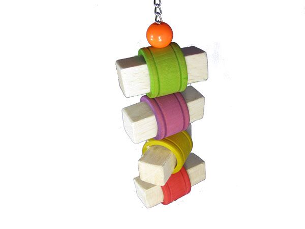 4 wooden rings stuffed with balsa wood blocks and strung through a nickel-plated chain. Makes a great destructible toy for birds that are intimidated by hard woods.