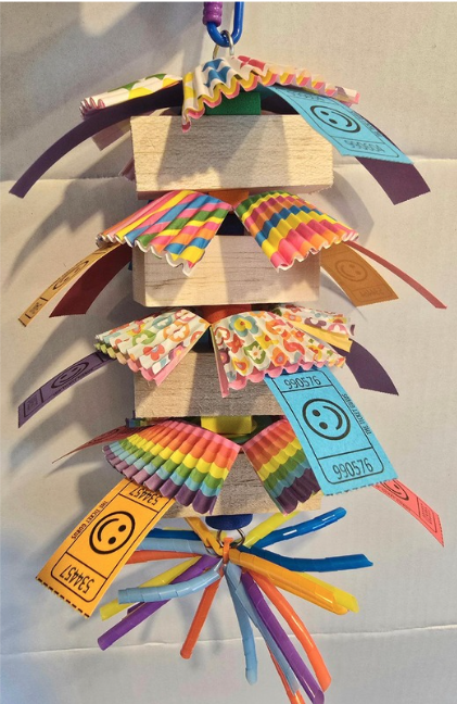Colorful foam beads, cupcake liners, paper tickets, balsa wood rectangles, and plastic straws strung together on a stainless-steel rod. Makes a great shredding toy for small or medium-sized birds.