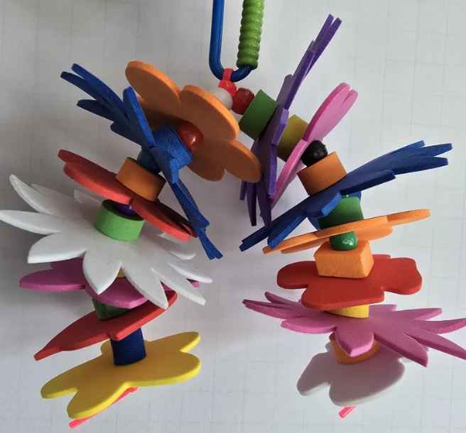 Two strands of colorful foam flowers, foam cubes, and plastic beads supported by a quick link. Makes a great shredding toy for small birds.