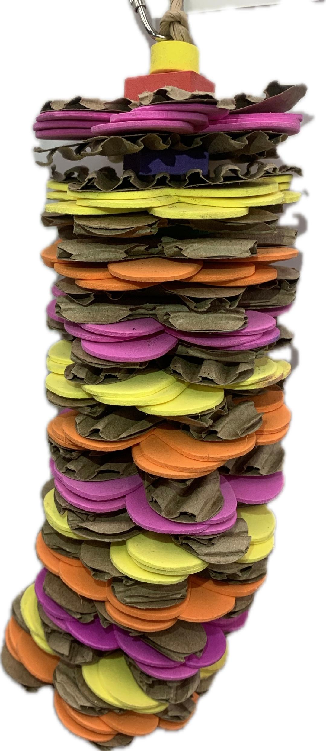 Cardboard flowers, foam flowers, and foam cubes strung through a paper rope and supported by a quick link. Makes a great destructible toy for a small or medium sized bird.