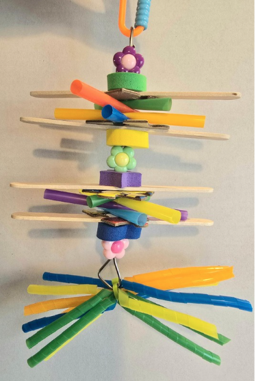 Colorful flower beads, foam beads, popsicle sticks, puzzle pieces, and plastic straws strung together on a stainless-steel rod. Makes a great shredding toy for small birds.