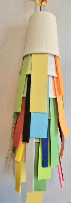 Paper cups, foam strips, cardstock strips, and a flower bead strung through a stainless-steel rod. Makes a great shredding toy for small or medium-sized birds.