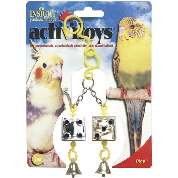 Reflective hanging dice toy for parakeets, cockatiels, and other similarly sized birds.