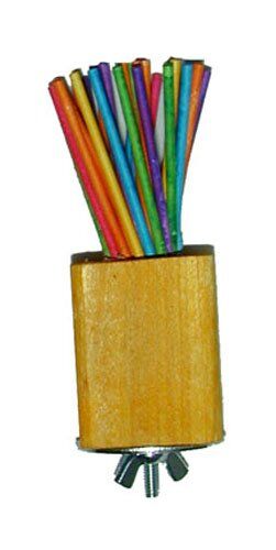 Paper lollipop sticks that birds love to chew and peel, bunched together in a sturdy wooden block that bolts to the side of the cage.
