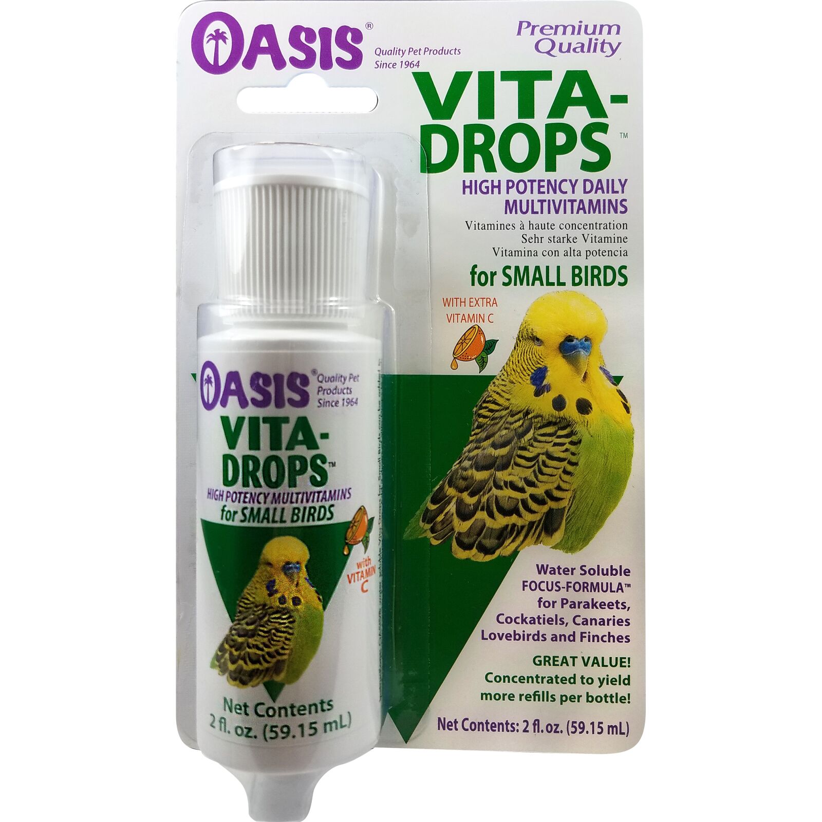 Sprayable FOCUS-FORMULA multivitamin for small cage birds of all ages and types. A convenient way to assure your birds are receiving the vitamins that help with normal growth, development, full feathering, and brilliant color.