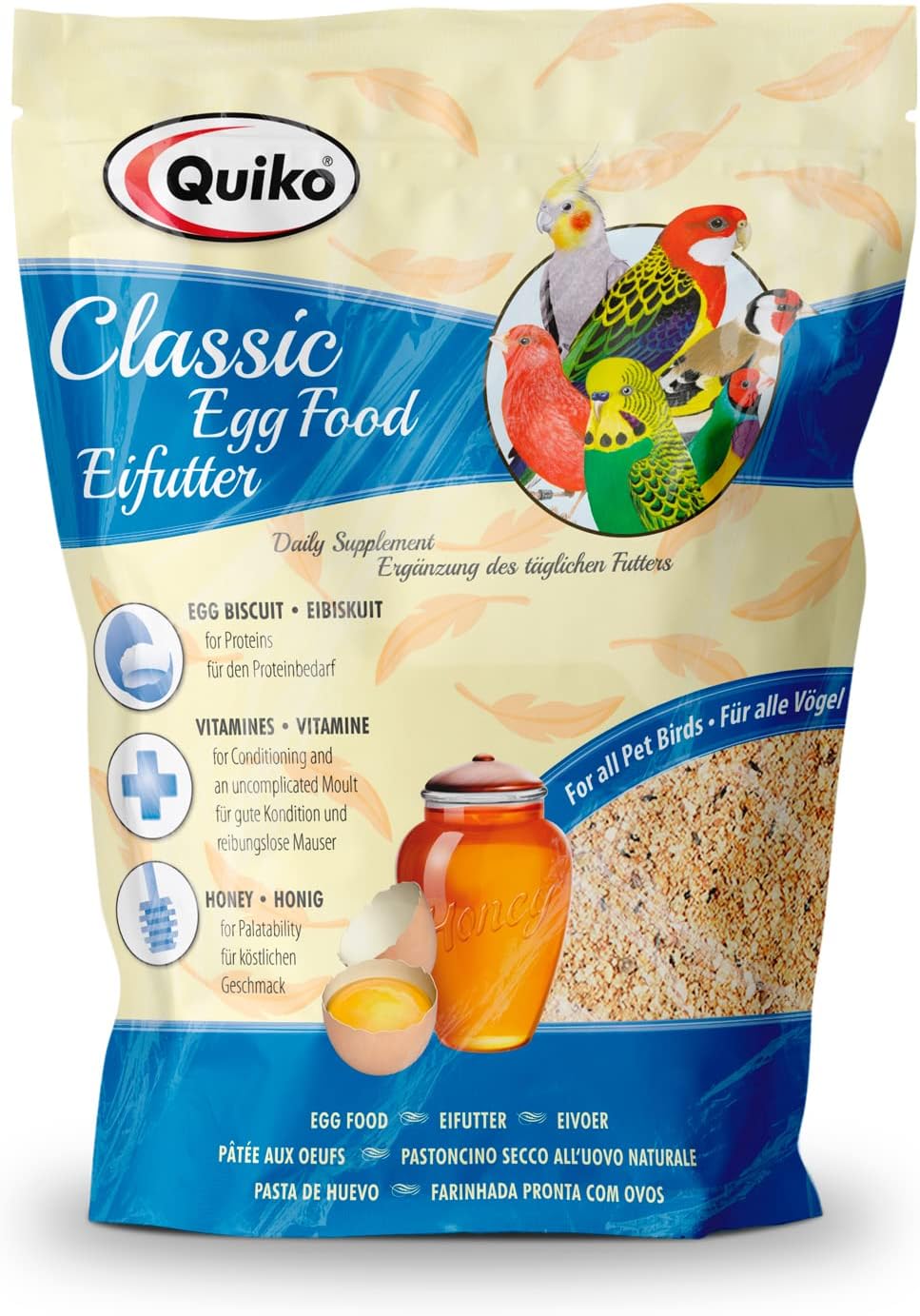 A variety diets is key to having healthy birds. Unfortified seed diets are relatively low in protein and lack many essential vitamins. Pelleted diets do not offer variety and can be poorly accepted. Adding egg to any of these foods increases protein and vitamin levels of the overall diet. Made with real whole eggs, Quiko Classic Egg Food has a very high bioavailability due to the excellent profile of amino acids present in eggs, which are the building blocks of protein. This means that the nutrients are readily available for the bird’s system. Because most birds eat the egg food before anything else, it is also the perfect means to introduce additional vitamins or medication when necessary.