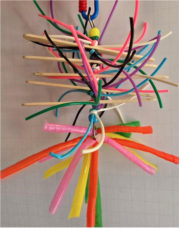 Popsicle sticks, plastic beads, and plastic straws strung together on a stainless-steel rod. Makes a great shredding toy for small birds.