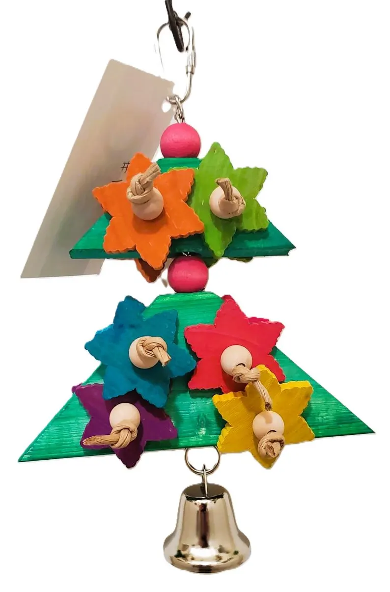 Two wooden triangles with leather strips and colorful wood pieces strung together to look like a Christmas tree. Makes a great destructible toy for medium sized birds.