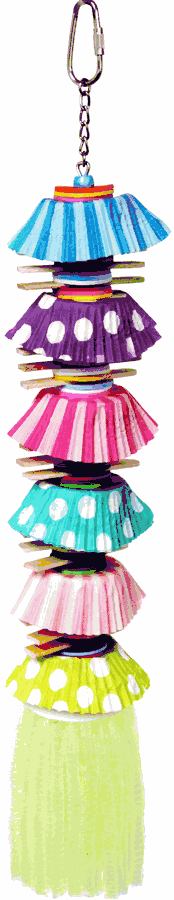 Colorful cupcake wrappers, popsicle sticks, foam discs, and plastic straws strung through a stainless steel wire and supported by a quick link. Makes a great destructible toy for small or medium sized birds.