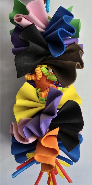A small plastic ball with rubber springs woven through its holes, sandwiched between two bundles of colorful foam strips. Makes a great shredding toy for small or medium-sized birds.