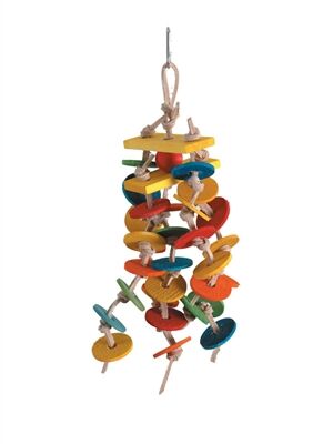 Two long blocks with strands of leather filled with colorful discs