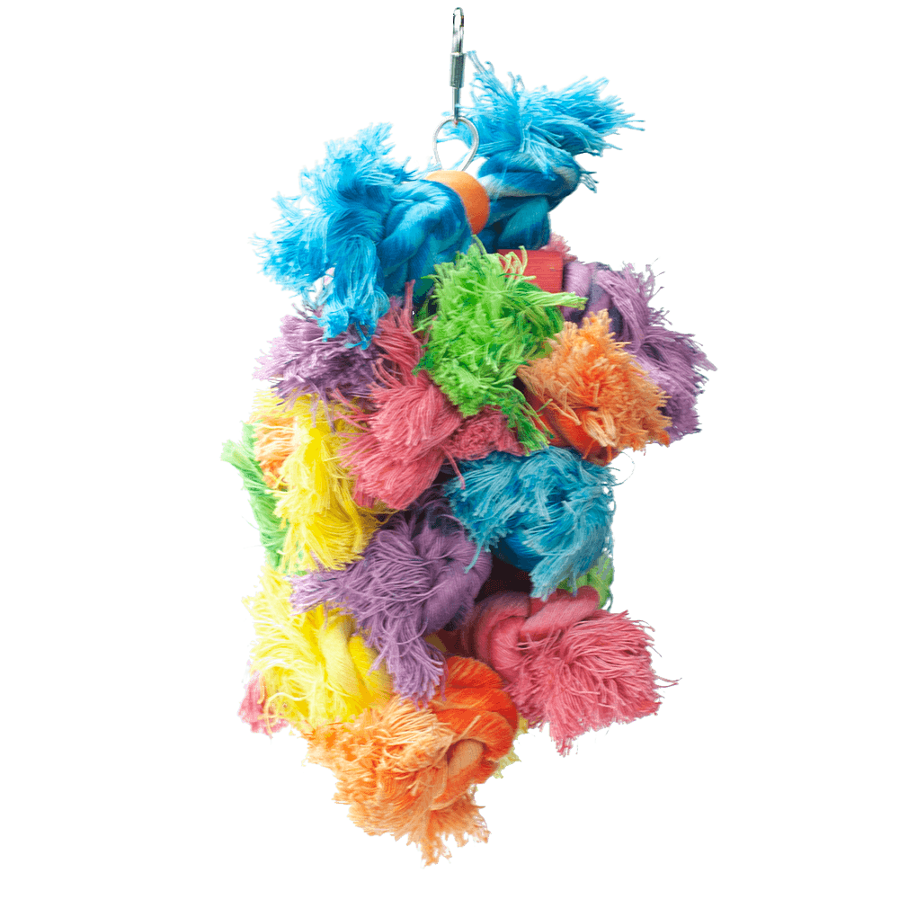 Several bundles of colorful cotton ropes for your feathered friend to chew on and preen. Makes a great toy for birds who are prone to feather plucking