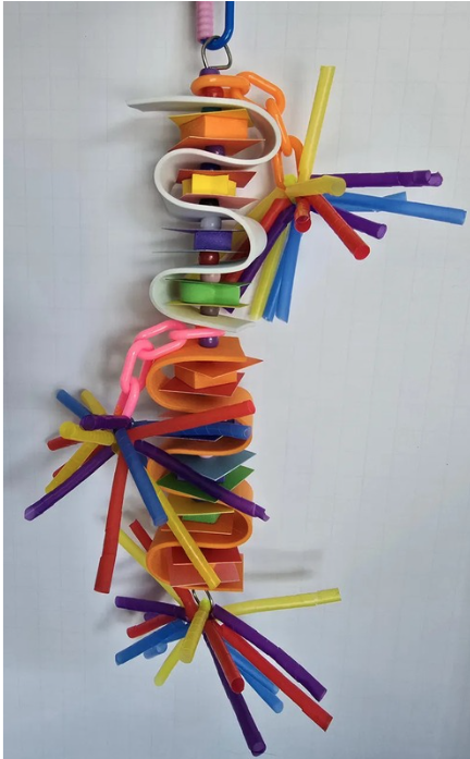 Colorful foam strips, foam cubes, paper squares, and shredded plastic straws strung together and supported by a quick link. Makes a great shredding toy for small birds.